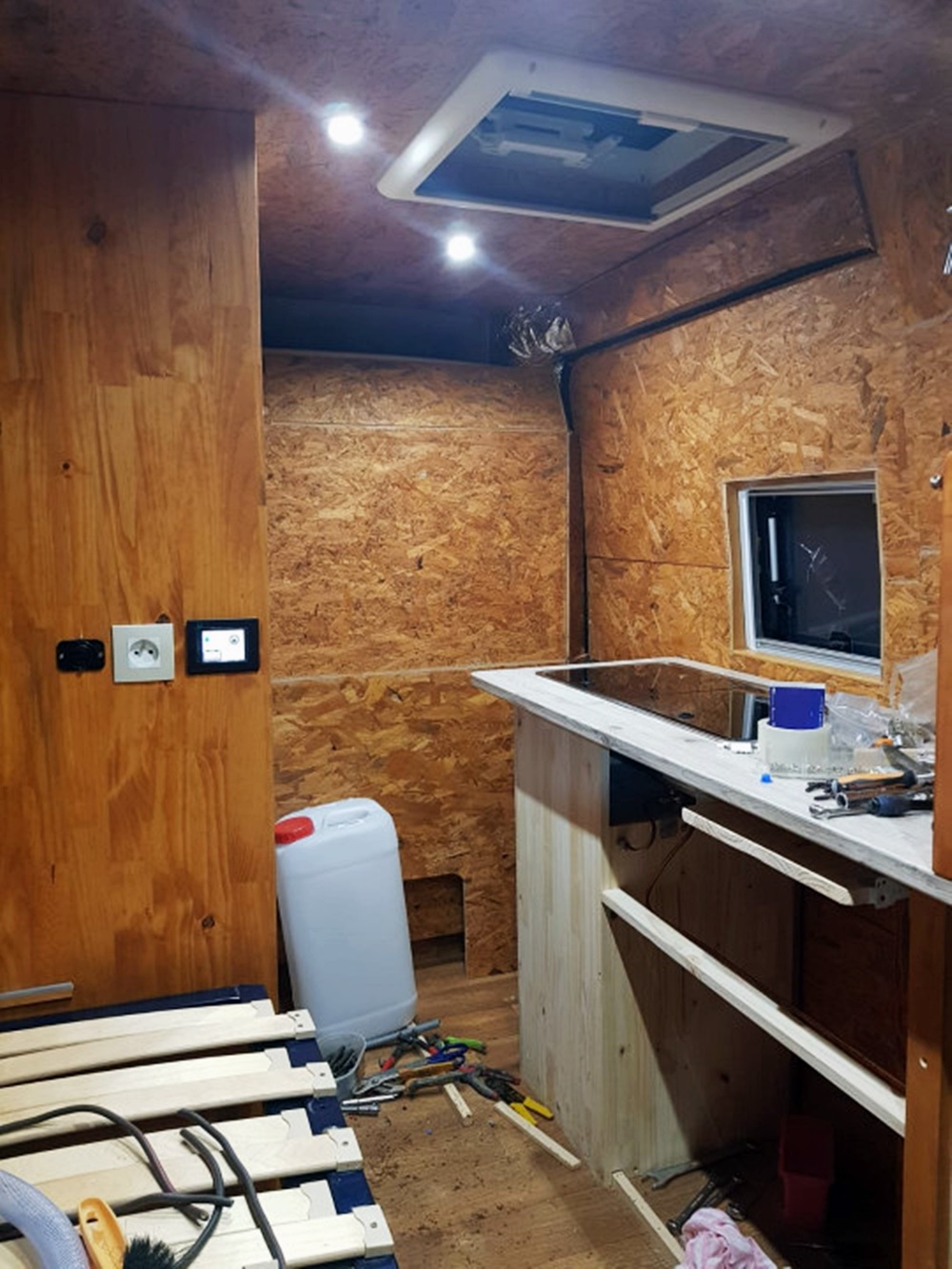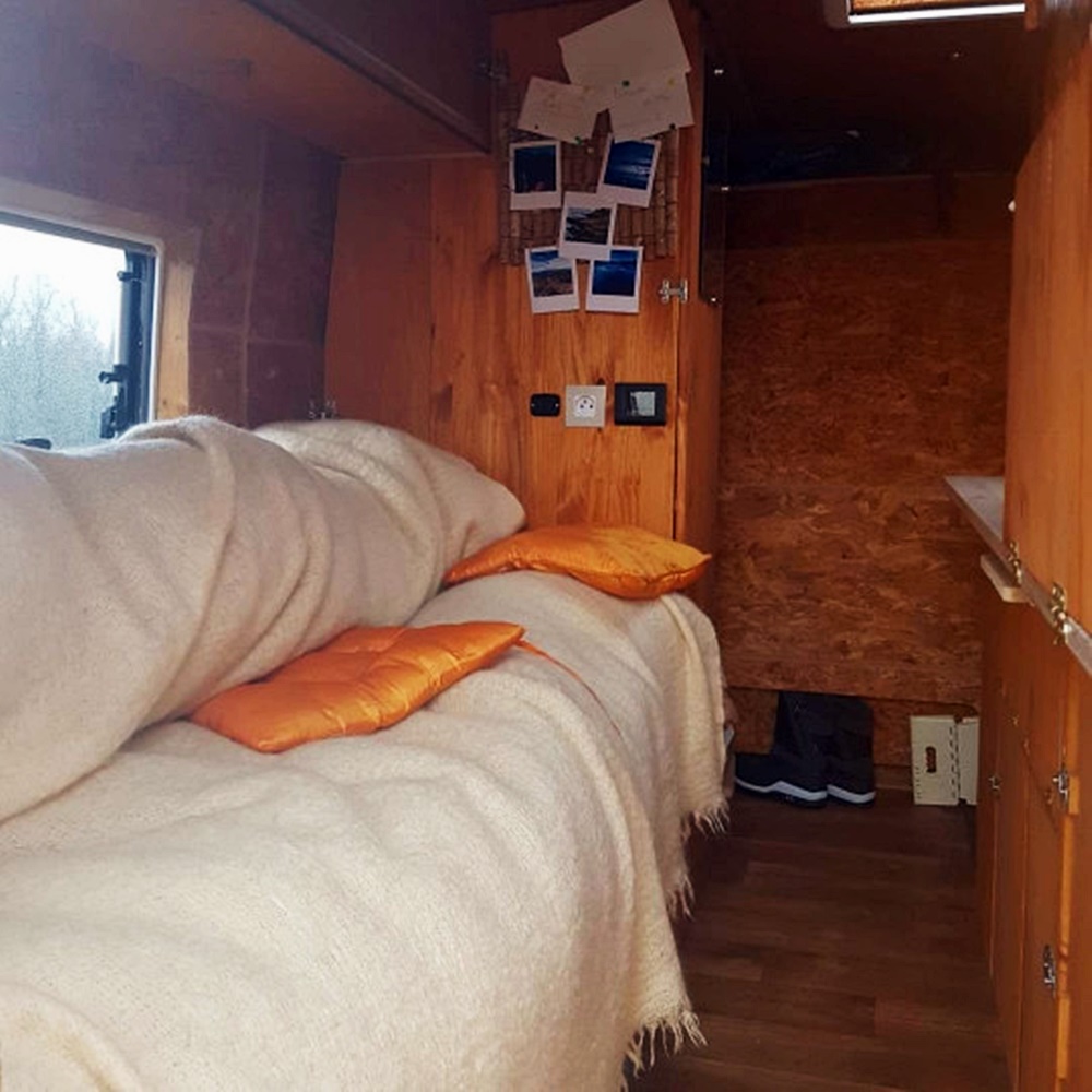 그는 단열하는 것으로 개조를 시작해 가스와 싱크대가 있는 부엌을 만들었고, 이후 에어 히터를 설치하고, 수납장을 만들었으며, 낡은 침대 프레임으로 접이식 더블 침대를 만들었습니다. 전기는 태양열로 작동하며 작은 변기와 태양열 샤워기도 있다고 하네요. 물은 한번에 40리터만 저장되지만 이 커플은 40리터로도 충분히 일주일은 쓸 수 있다고 하네요. 이들은 캠핑카보다 야외에서 물을 더 많이 이용하기 때문입니다. 캠핑카에는 일을 할 수 있는 책상도 구비되어 있으며 깨끗한 물을 구할 수 없을 때를 대비해 강물을 마실 수 있도록 정수 필터도 구비해두었습니다. 이모든 작업을 완료하는데는 6개월이 걸렸고, 대부분은 DIY로 작업을 했기에 밴을 개조하는데 든 비용은 4,000유로 우리 돈으로 약 540만원 정도 밖에 들지 않았습니다.