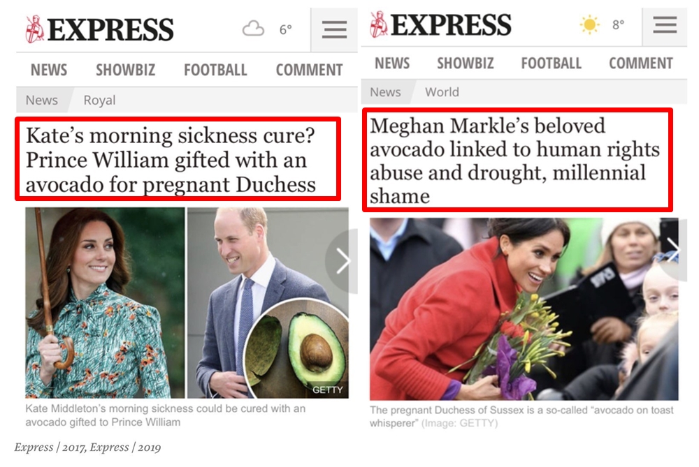 이뿐만이 아니었습니다. 케이트 미들턴이 아보카도를 먹으면 칭송을 받았지만 자신이 아보카도를 먹으면 환경 파괴범이 되었다고 말했습니다. 실제로 이 둘을 향한 언론의 태도는 사뭇 달랐는데요. 케이트 미들턴이 임신한 배 위에 손을 올리면 모성애로 둔갑되고, 메건 마클이 배 위에 손을 올리면 '왜 배 위에서 손을 안 떼냐?'면서 자의식 과잉으로 몰아갔습니다. 같은 웨지힐을 신어도 케이트 미들턴은 '실용적인 신발'이라고 칭송받았고, 메건 마클은 '왕실의 의전을 무시했다'는 기사가 나왔습니다.