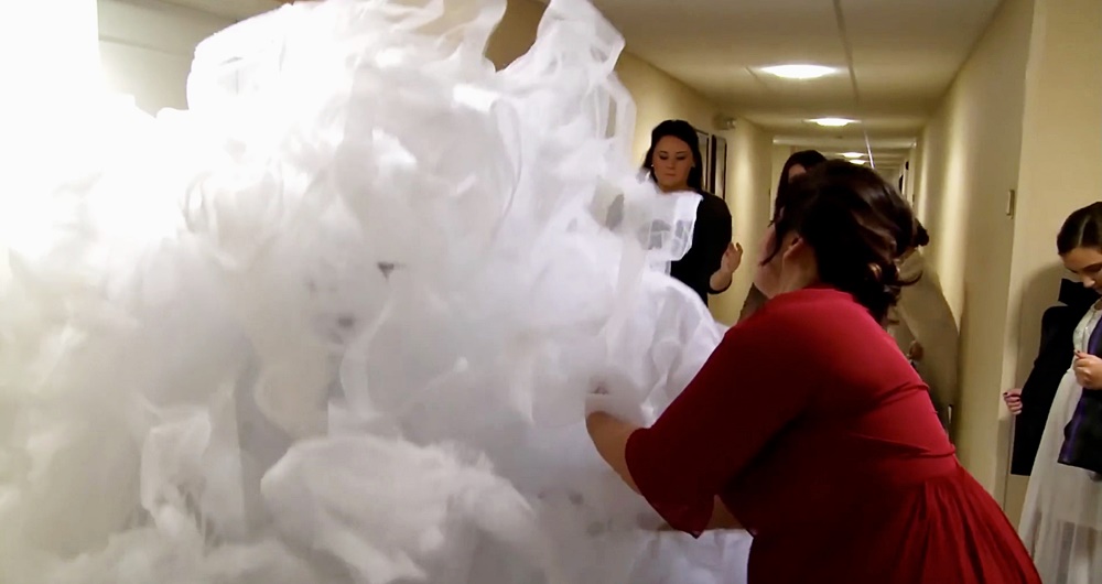 이들은 결국 웨딩 드레스를 완성했습니다. 몸통 부분은 몸에 피트 되는 디자인의 보디스였으며 스커트는 A라인, 그리고 트레인은 180미터 이상의 실크 오간자로 만들어졌습니다. 여기까지는 순조로웠습니다. 그러나 문제는 신부가 웨딩드레스를 입고 어떻게 결혼식장으로 이동해야 하는지였죠.