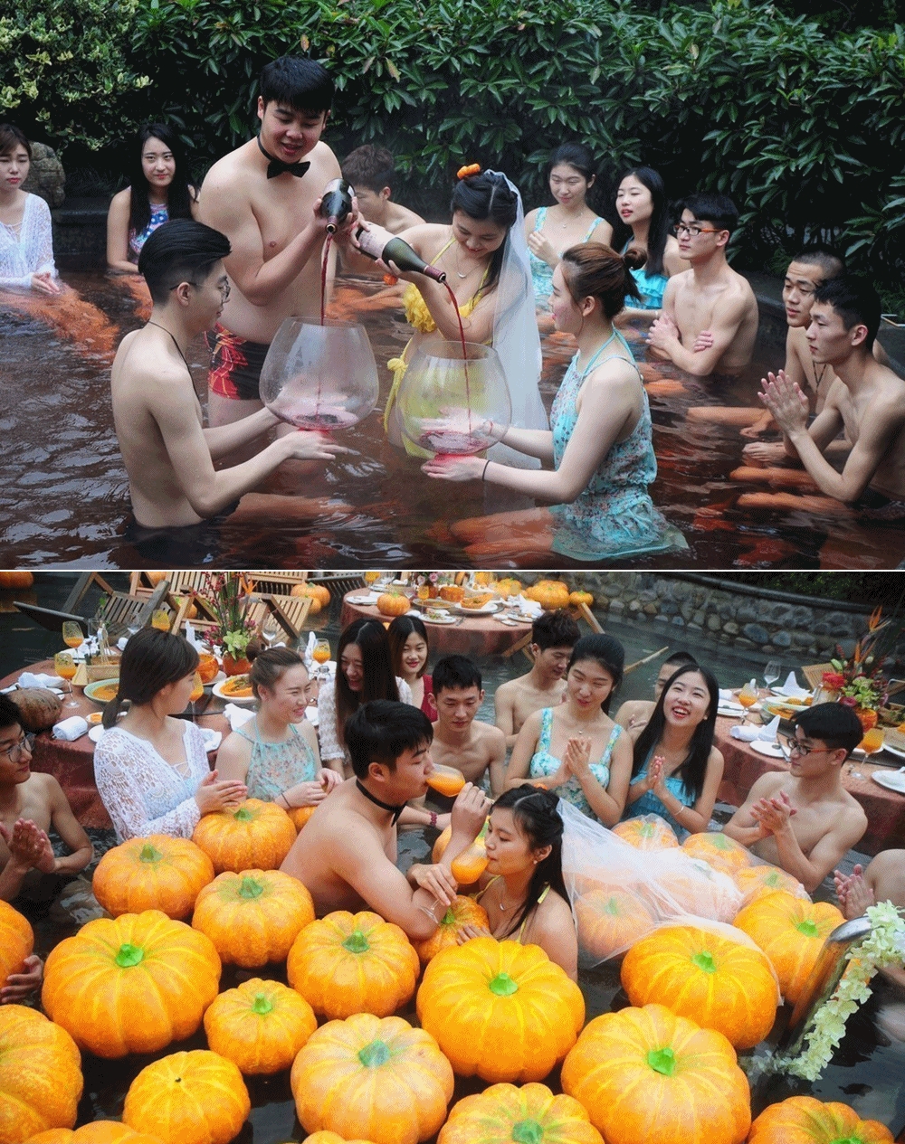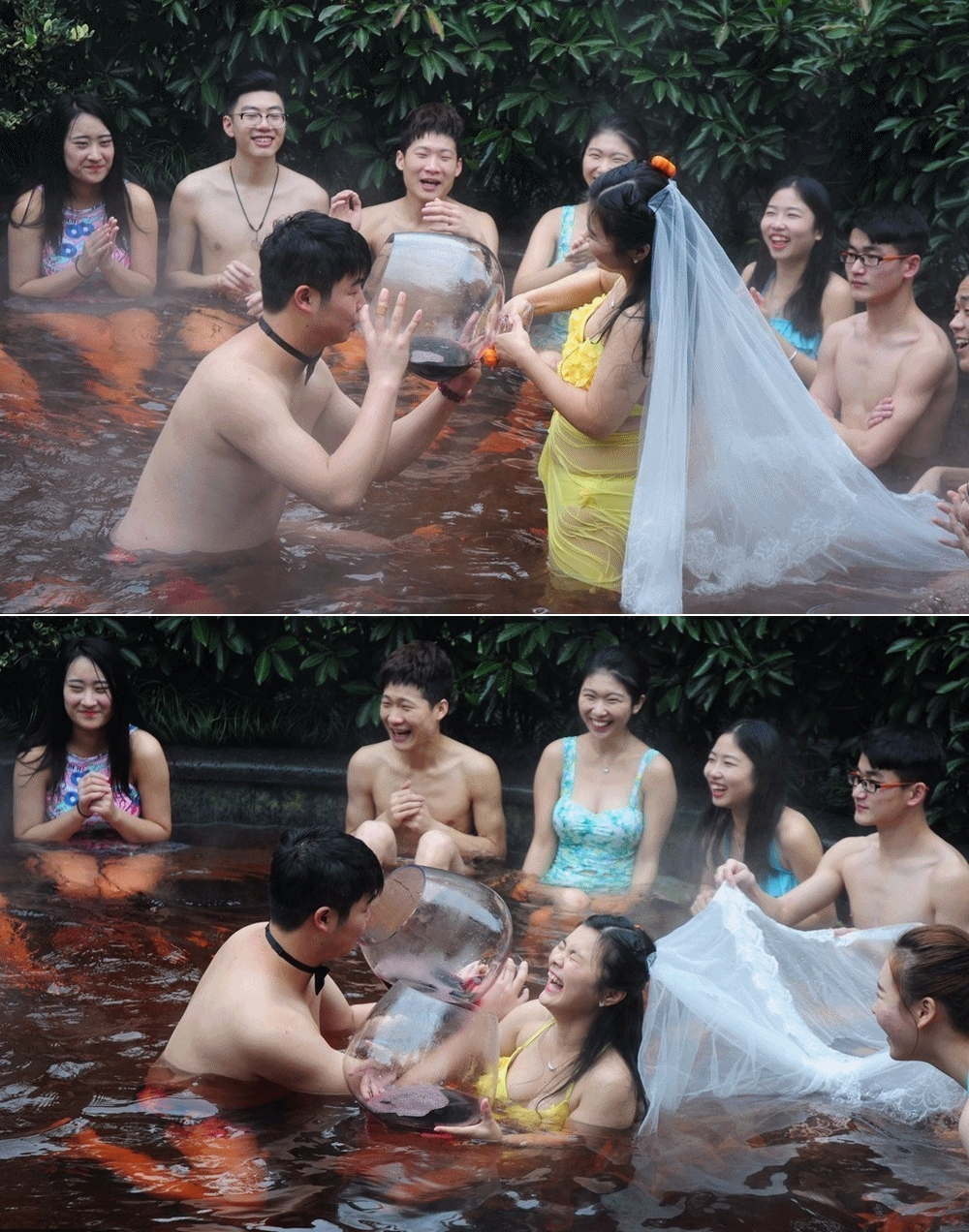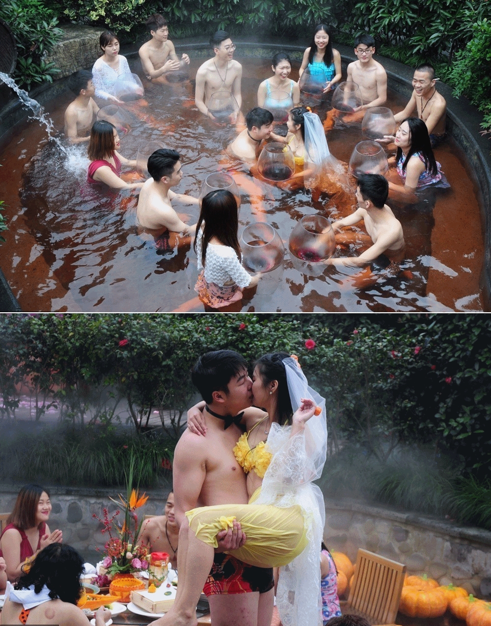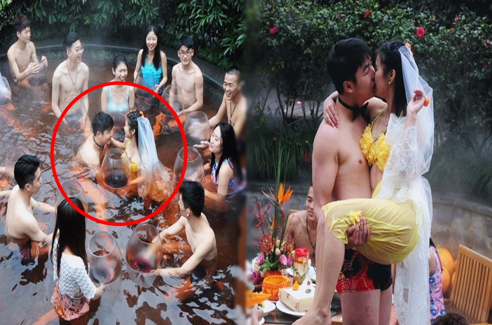 이 결혼식은 중국의 저장성에 위치하고 있는 항저우에서 신부 저우톈종, 신랑 장팅이 계획한 것인데요. 이들은 김이 모락모락 나는 온천을 빌려 온천 속에서 결혼식을 거행했습니다. 신랑은 수영복 하의에 보우타이를 맸고, 신부는 노란색 비키니를 입고 하얀 베일을 썼는데요. 보우타이와 베일이 아니었다면 결혼식 인지도 알 수 없을 정도로 자유분방한 분위기였습니다.