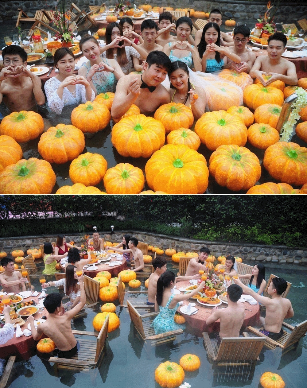 결혼식의 테마는 '호박'이었습니다. 이들은 물에 뜨는 호박을 온천에 띄워놓고, 테이블과 의자도 모두 온천 안에 설치했는데요. 하객들은 호박 주스를 마셨고, 호박죽을 먹었으며, 호박으로 만들어진 음식을 먹었습니다. 호박은 건강을 기원하는 의미가 있다고 하는데요. 하객들은 호박으로 만들어진 음식을 먹으며 건강한 결혼 생활, 그리고 건강한 부부 생활과 건강한 아이를 출산하기를 기원했습니다.