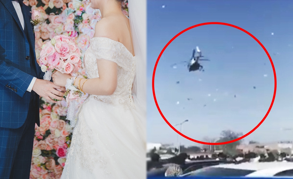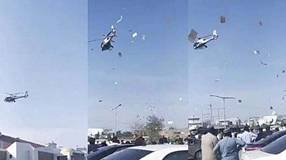 영상을 촬영한 곳은 파키스탄인데요. 파키스탄에서 결혼식에 참석해 신랑 신부의 결혼을 축하해준 하객들을 위해 특별한 이벤트를 준비한 것이었습니다. 바로 하객들이 모여있는 곳으로 헬리콥터를 띄워 이곳에서 장미꽃잎과 지폐를 뿌리는 것이었습니다. 하객들은 서로 뒤엉켜 하늘에서 내리는 돈을 잡으려고 이리저리 다니고 있으며 헬리콥터에서는 끝도 없이 지폐가 비처럼 내리고 있네요.