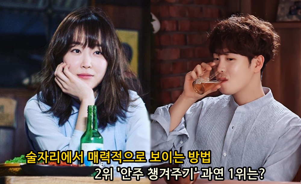 그만 마시라고 말하며 챙겨주는 것보다 더 좋은 방법은 바로 물이나 안주를 챙겨주는 것입니다. 먼저 요청하지 않았는데도 먼저 물을 상대방의 앞에 놓아준다든지, 멀리에 있는 안주를 가까이 가져와 주는 것이죠. 특히 남성 응답자의 39.8%가 물이나 안주를 챙겨주는 이성이 매력적으로 보인다고 답하며 이는 남성 답변 1위로 올랐습니다.