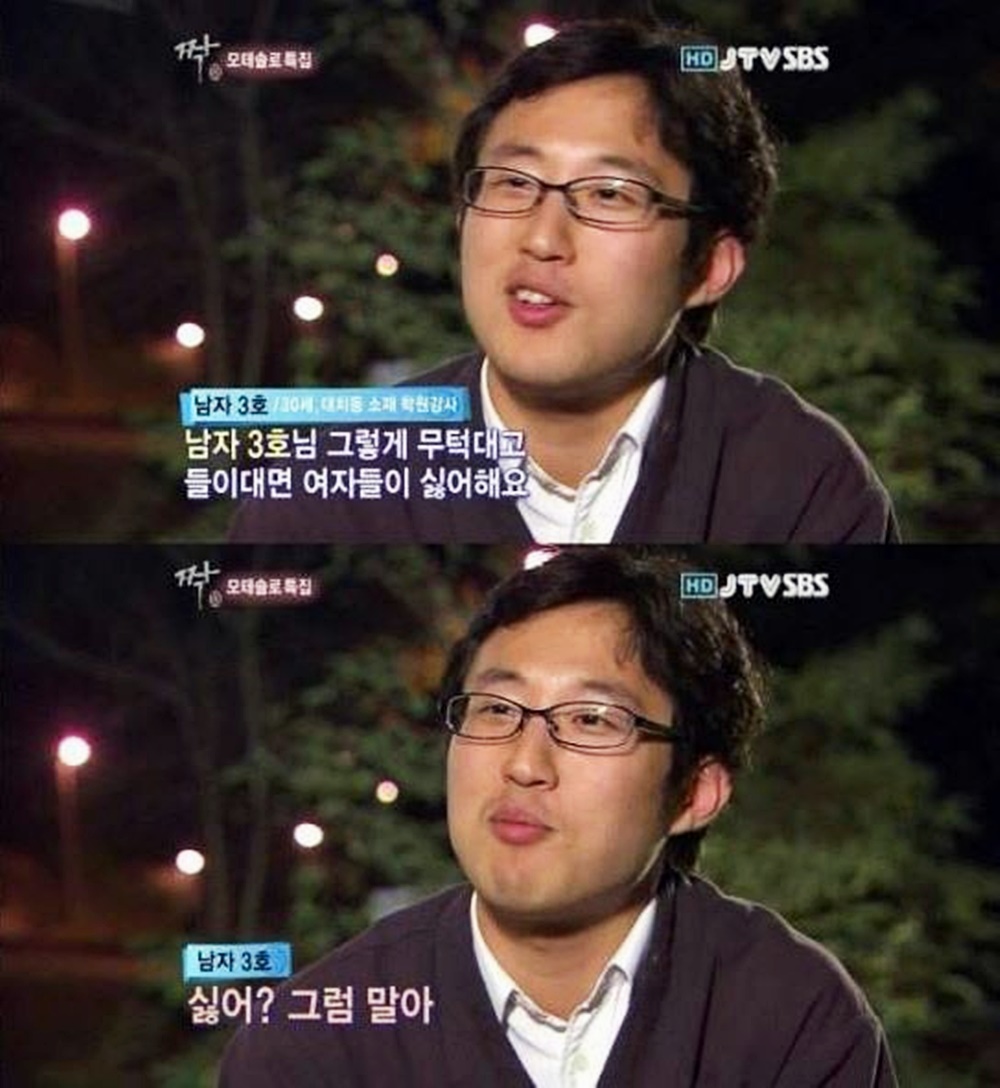 모태솔로는 왠지 모르게 답답할 것 같다는 응답도 있었습니다. 27%의 응답자가 이 답변을 내놓았습니다. 지난 2013년 방영된 SBS 리얼 예능 프로그램 <짝>에서도 모태솔로의 이런 모습이 방송에 공개되며 큰 화제가 되었는데요. 상대방의 기분이 언짢을 수 있는 농담을 계속해서 하고, 뭘 하든지 상대방에게 물어보고 했으며, 지나친 솔직함으로 상대방의 기분을 생각하지 않는 모습을 보였죠.